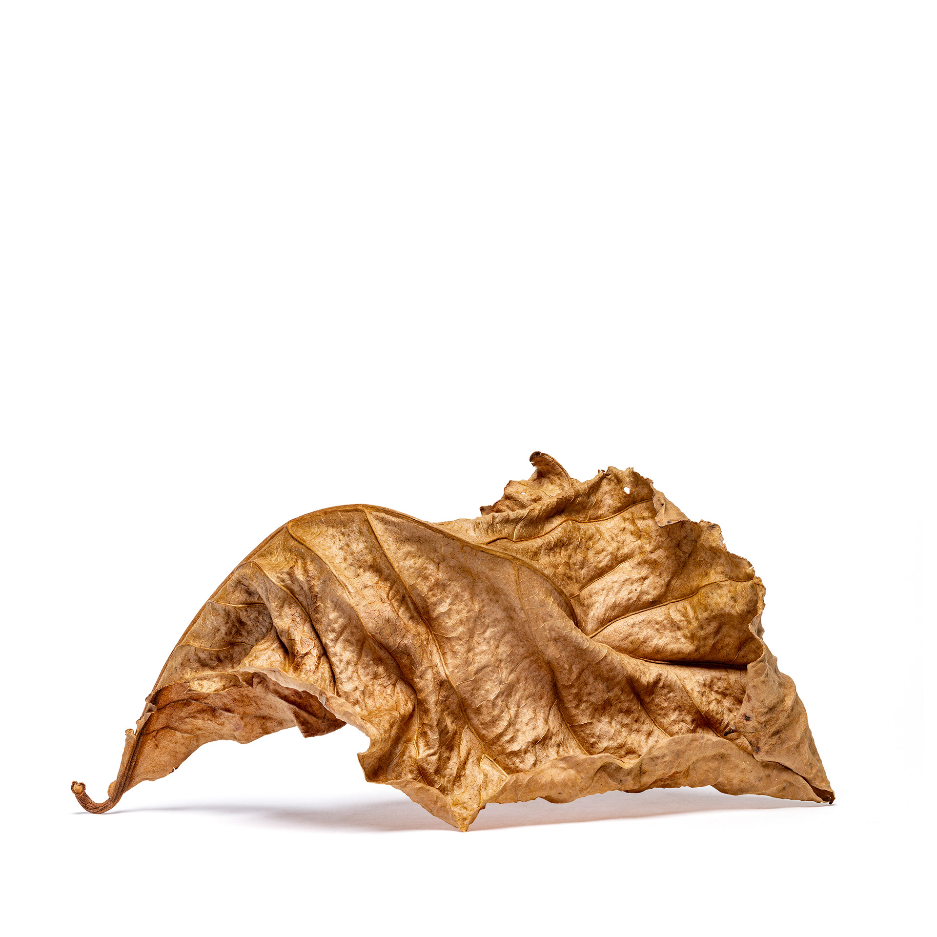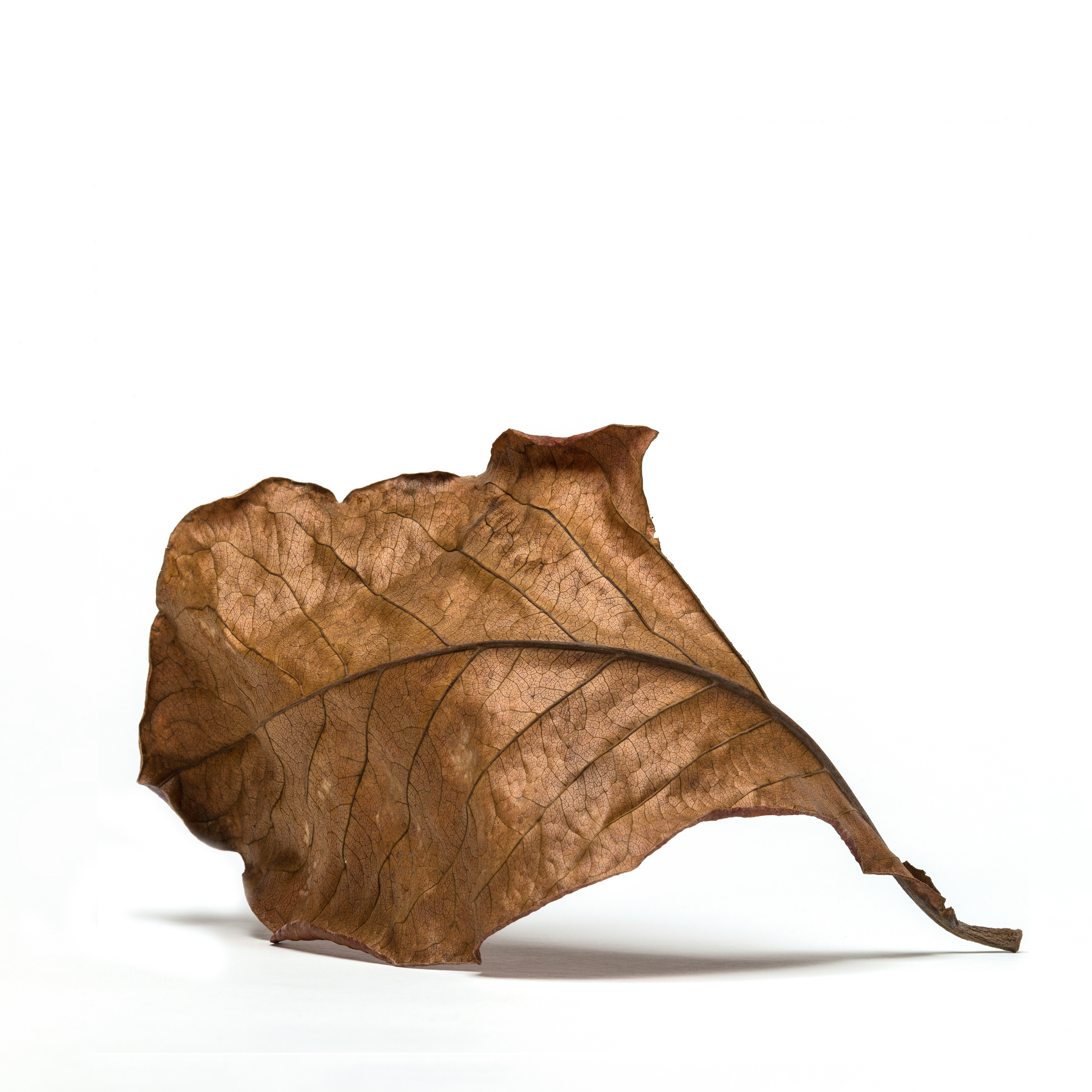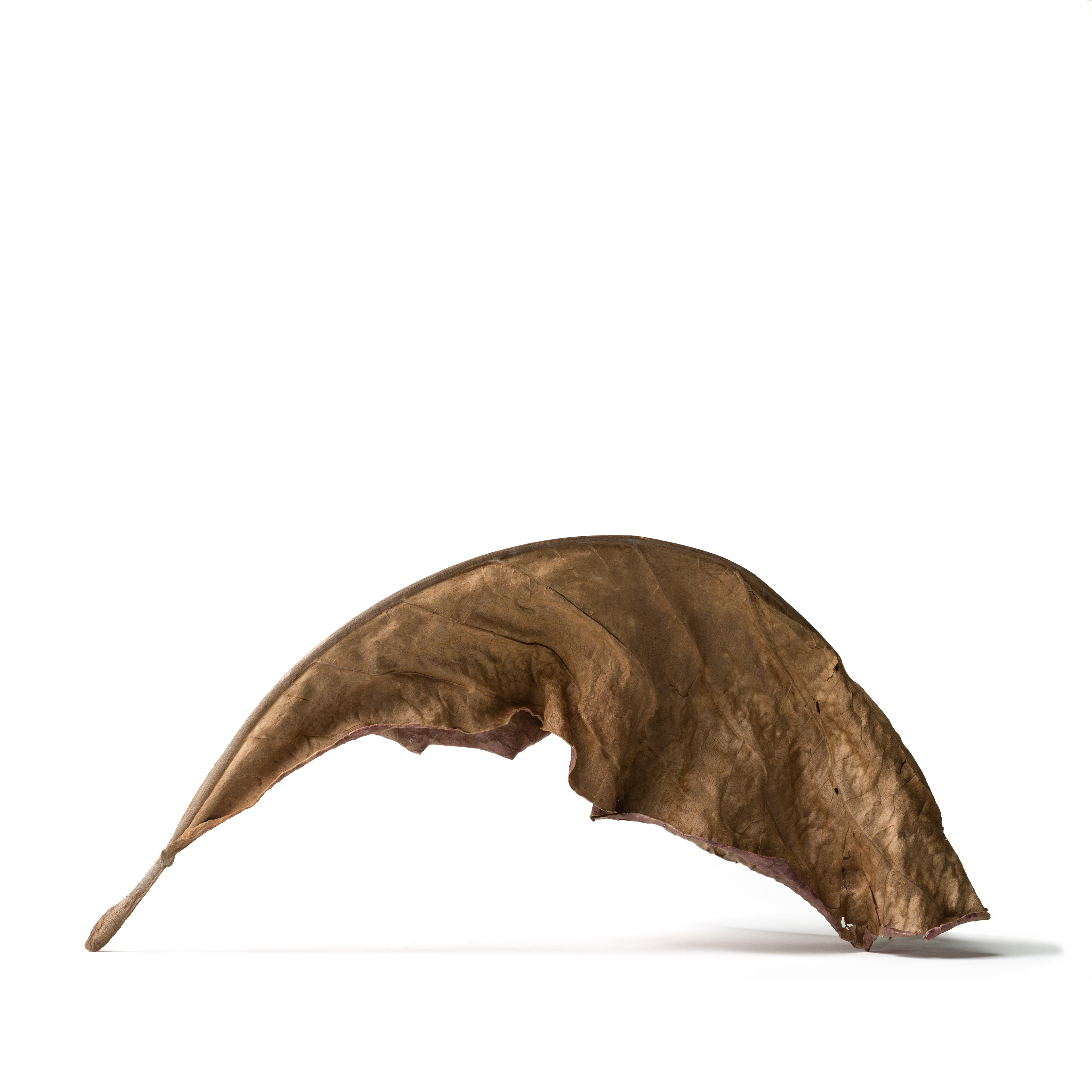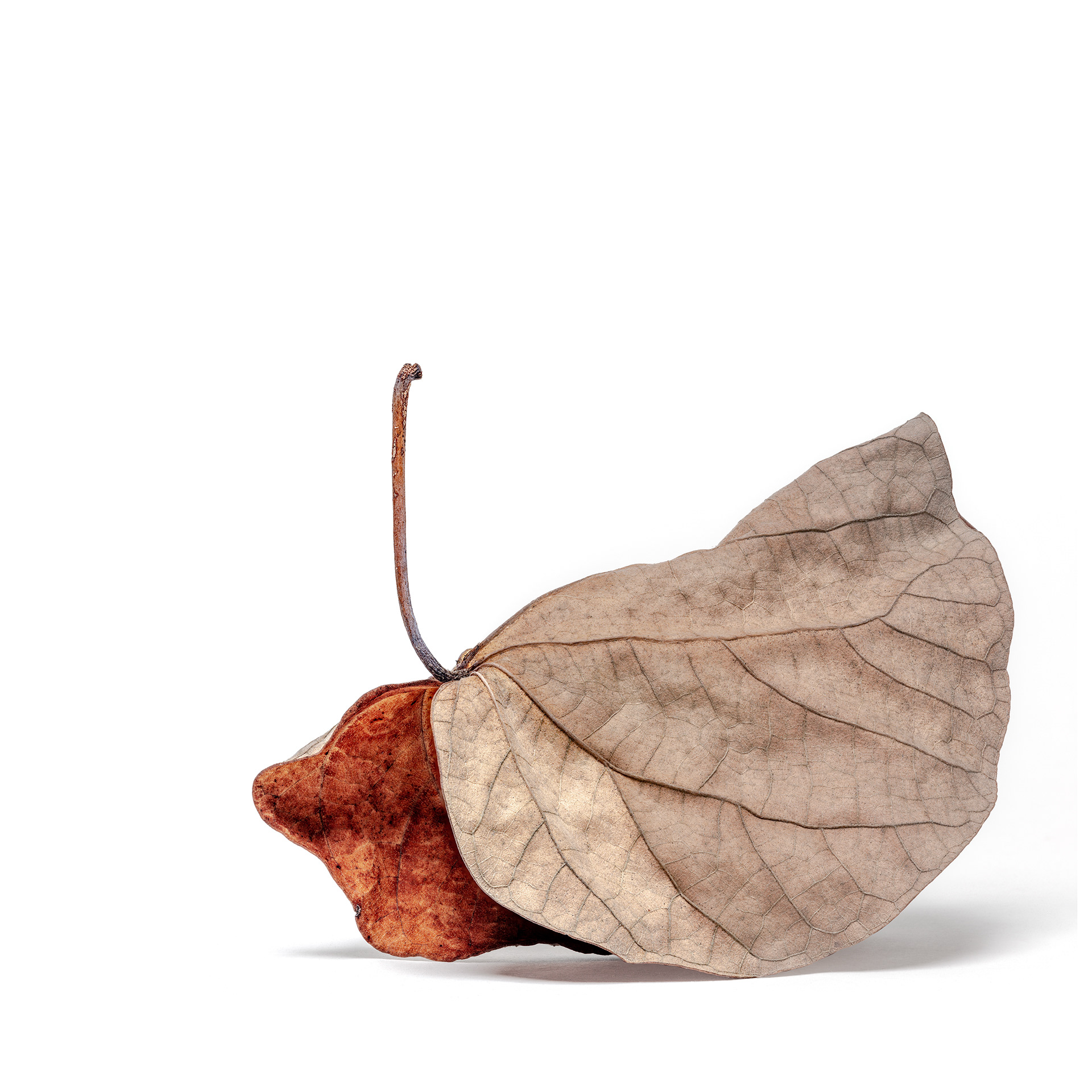 I photograph dry, fallen leaves as portraits. Isolated against a white background, they are removed from context and allowed to assert their individual presence—creases, veins, fractures, and asymmetries revealing distinct personalities shaped by time and decay. These images function as a reflection on the photographic camera itself: a tool that appears to faithfully translate a three-dimensional world into two dimensions, yet is always mediated by the photographer’s technical and aesthetic choices and by the perception of the viewer. Using deep focus through focus stacking, I produce hyper-realistic renderings that give the leaves an almost sculptural quality, especially when printed at larger-than-life scale. IN SIGNIFICANT LEAVES is not about documentation, but about attention—elevating the overlooked and exploring the quiet tension between objectivity and interpretation.