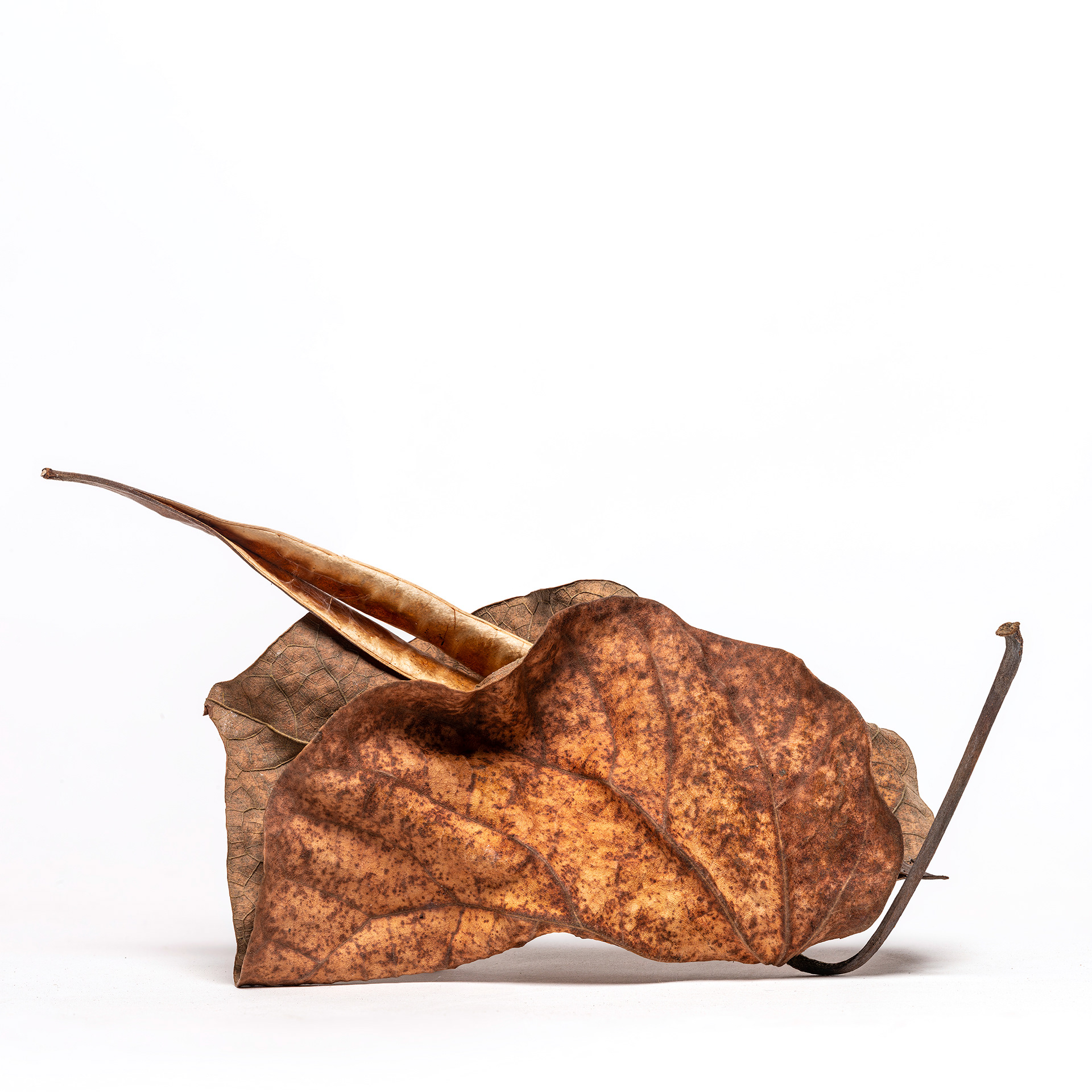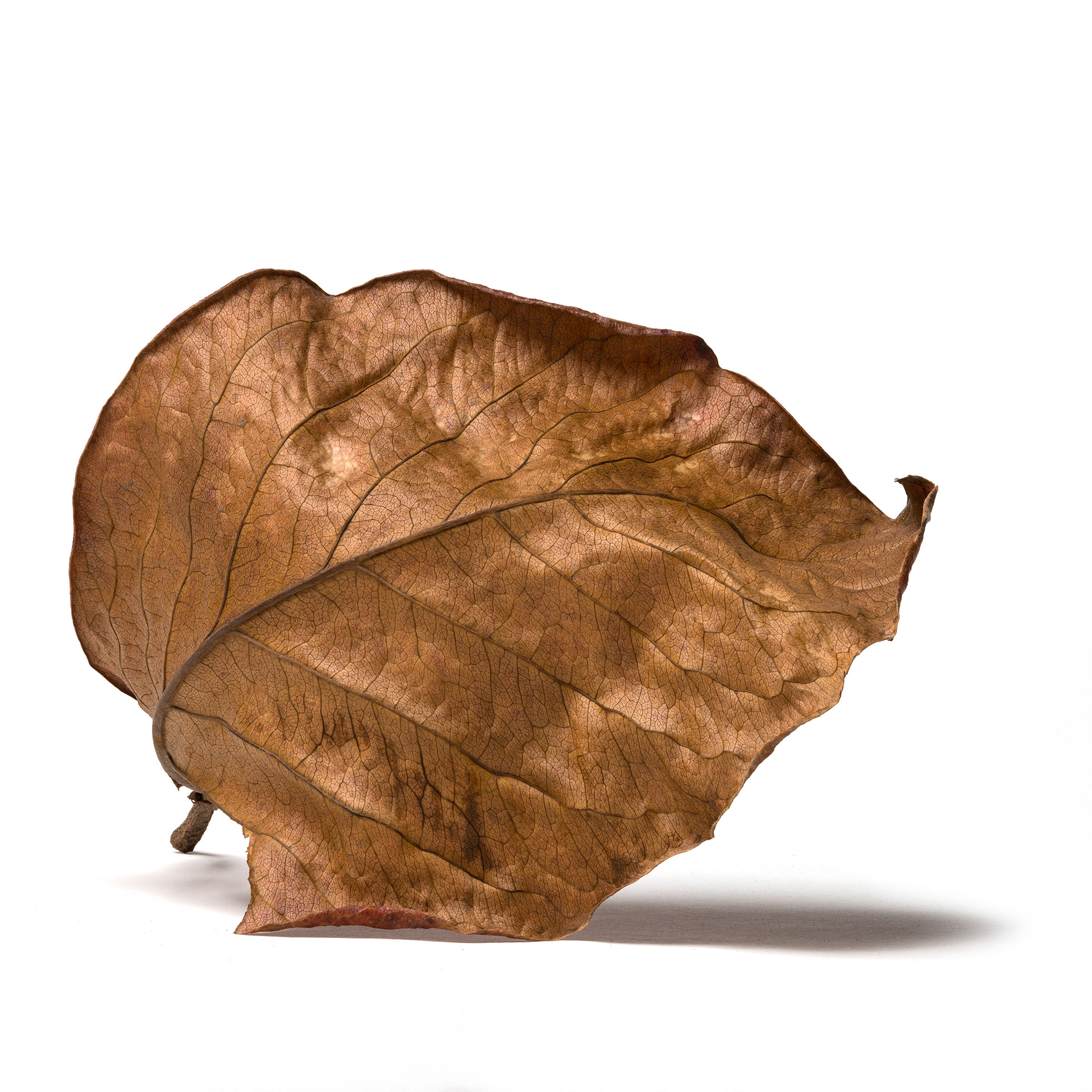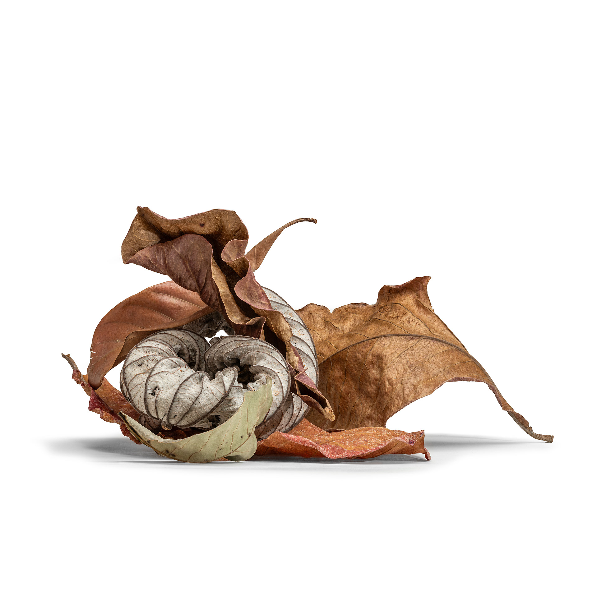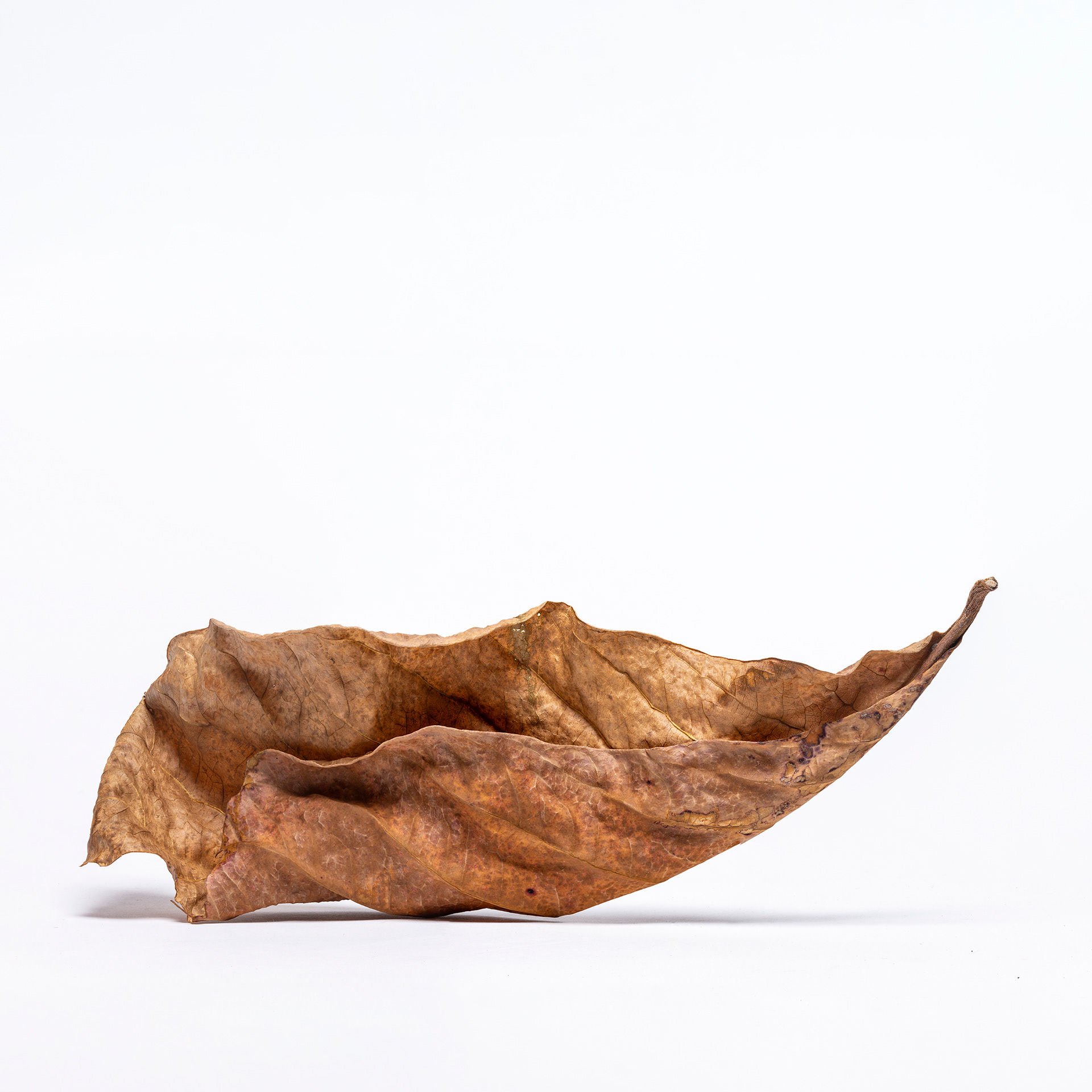 I photograph dry, fallen leaves as portraits. Isolated against a white background, they are removed from context and allowed to assert their individual presence—creases, veins, fractures, and asymmetries revealing distinct personalities shaped by time and decay. These images function as a reflection on the photographic camera itself: a tool that appears to faithfully translate a three-dimensional world into two dimensions, yet is always mediated by the photographer’s technical and aesthetic choices and by the perception of the viewer. Using deep focus through focus stacking, I produce hyper-realistic renderings that give the leaves an almost sculptural quality, especially when printed at larger-than-life scale. IN SIGNIFICANT LEAVES is not about documentation, but about attention—elevating the overlooked and exploring the quiet tension between objectivity and interpretation.